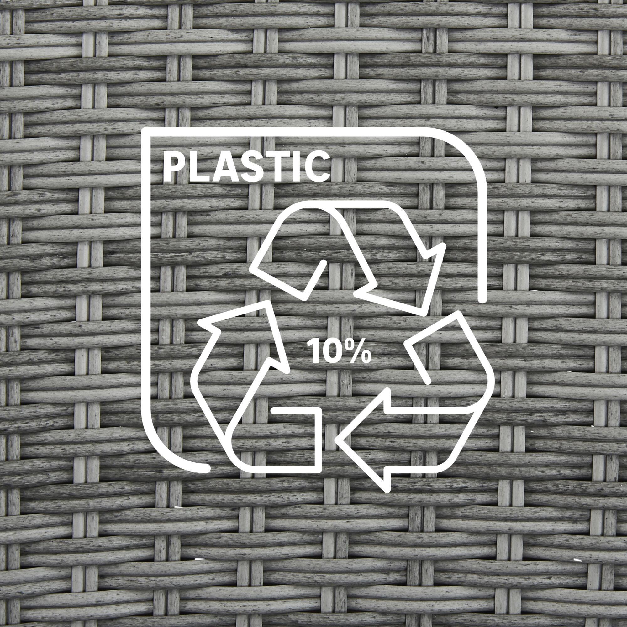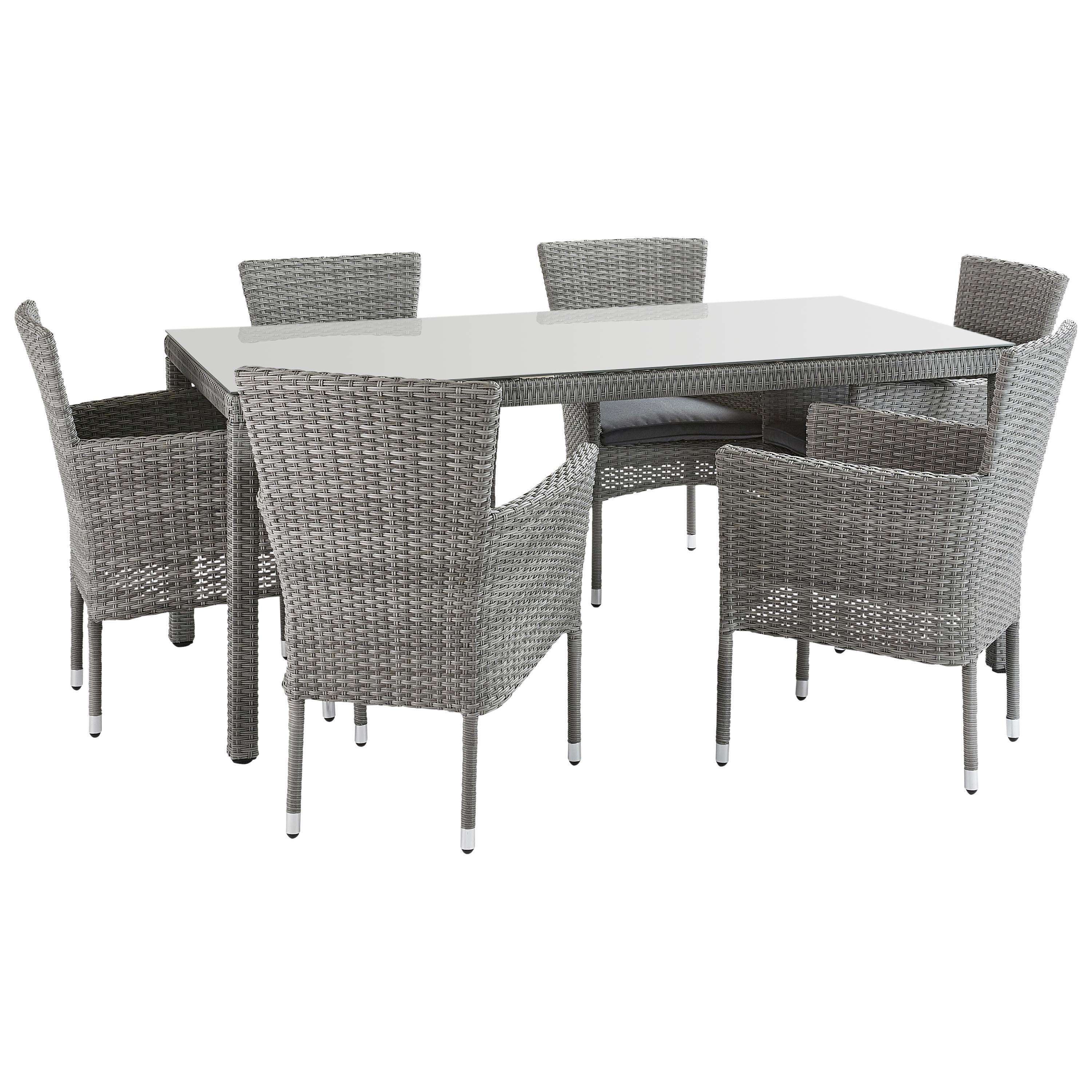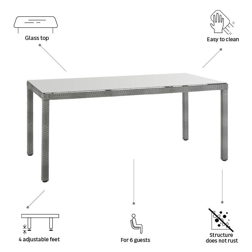 לשולחן Davos מראה אלגנטי של שרף ארוג ומשטח זכוכית, האידיאלי לארוחת צהריים או לעבודה בחוץ.
