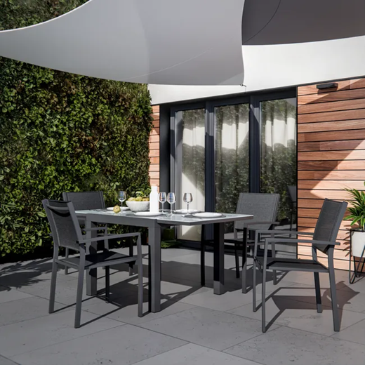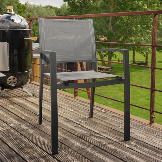 כיסא LYRA אידיאלי להשלמת פינת האוכל, הוא חזק ופרקטי כאחד הודות למבנה האלומיניום והשימוש בבד טקסטילן.