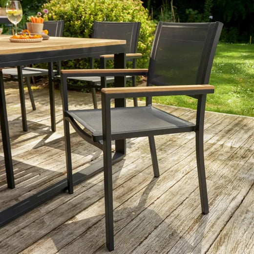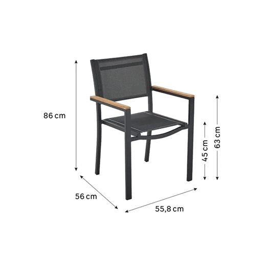 כסא גן ללא כרית Naterial. יש לו מבנה עשוי אלומיניום אפור ומושב טקסטיל. אידיאלי ליהנות מרגעים מרגיעים בחוץ. ניתן לערום כך שקל לאחסן אותו, והוא מגיע בהרכבה מראש. הוא מציע 3 שנות אחריות. מידות: 55.8 על 86 על 56 ס"מ (רוחב x גובה x עומק).