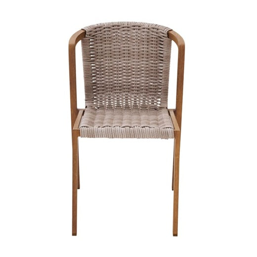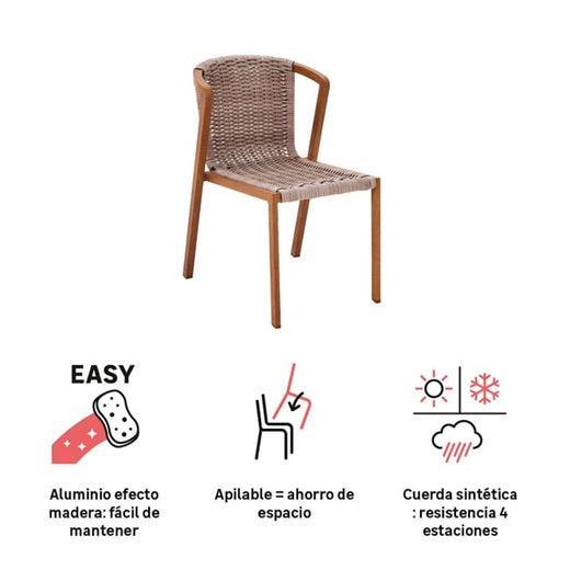 כיסא גן ללא כרית. כולל מסגרת אלומיניום בצבע עץ ומושב נצרים. אידיאלי להנאה מרגעי מנוחה בחוץ. ניתן לערום אותו לאחסון קל ומגיע מורכב מראש. מגיע עם אחריות לשלוש שנים. מידות: 52 x 81 x 65 ס"מ (רוחב x גובה x עומק).