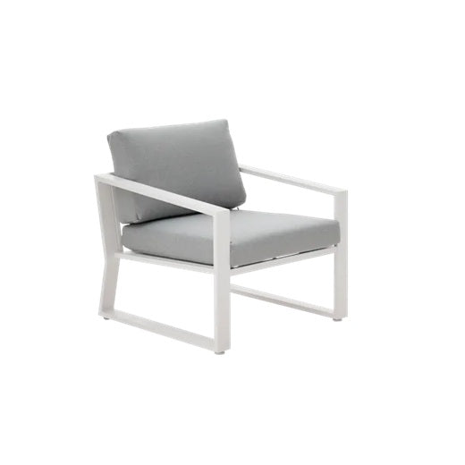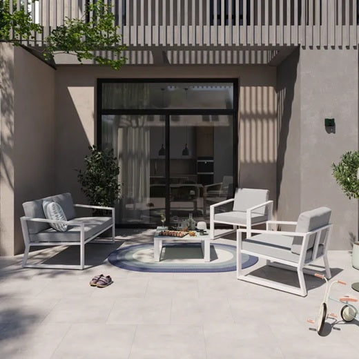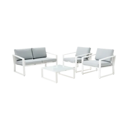 בלו רגע נעים בנוחות סביב מערכת הישיבה לגינה מסדרת Lyra. המערכת עוצבה עבור 4 אנשים, עשויה כולה מאלומיניום כדי להבטיח עמידות גבוהה בפני שינויי אקלים.