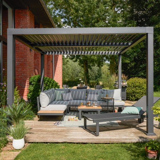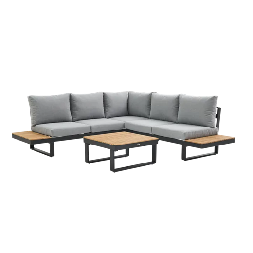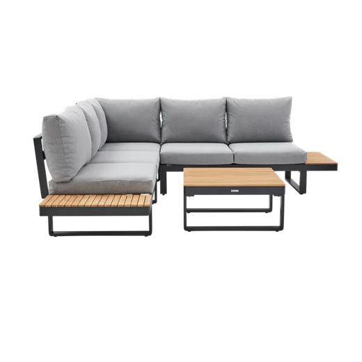 סט ריהוט מרפסת פינתי של Naterial Persea 5 מושבים. הוא מורכב משולחן מרובע עם מבנה אלומיניום אפור כהה ופלטת טיק, ומושב אלומיניום. אידיאלי לבילוי רגעים נעימים בחוץ בחברת משפחה וחברים. מוצר זה ניתן לתיקון ויש לו 3 שנות אחריות