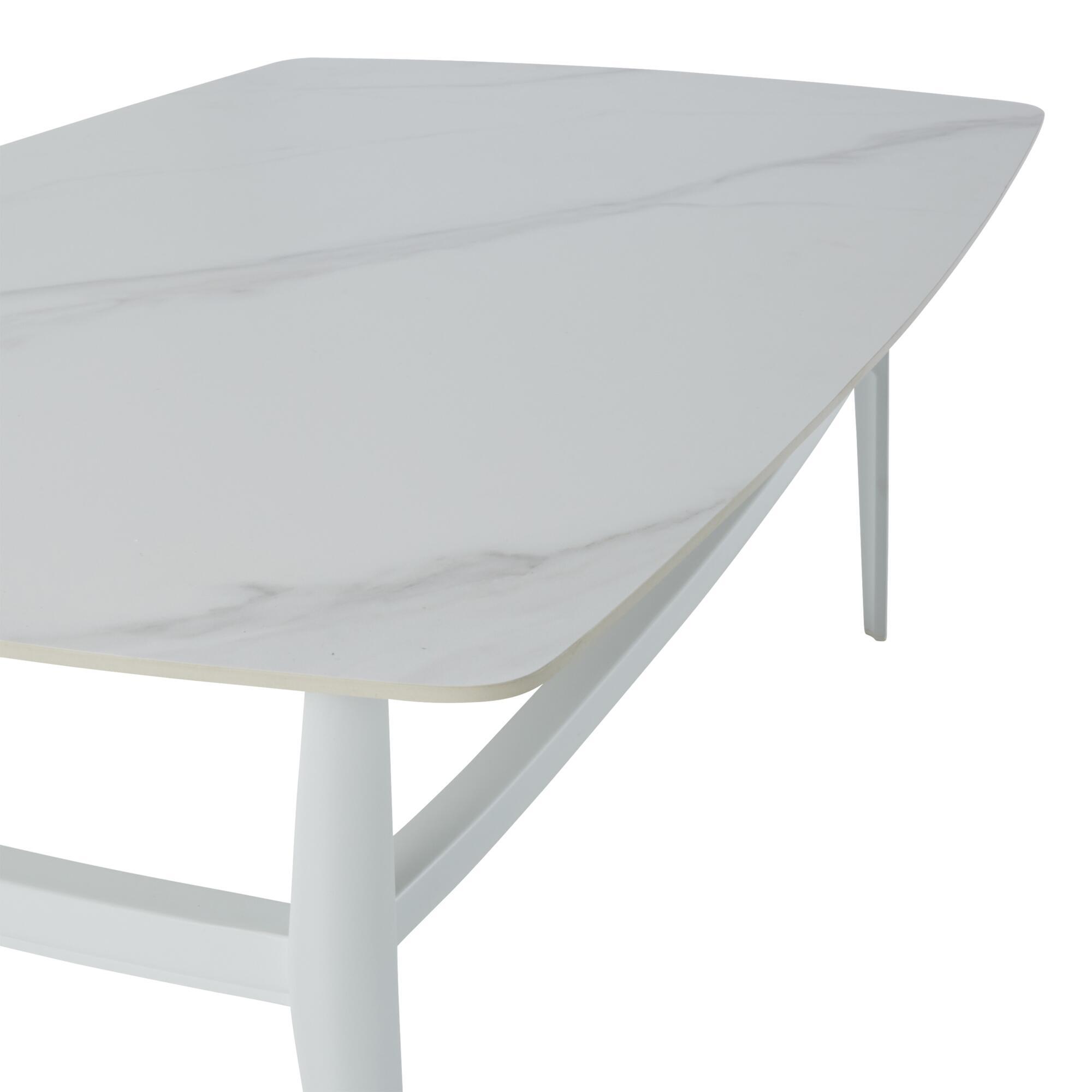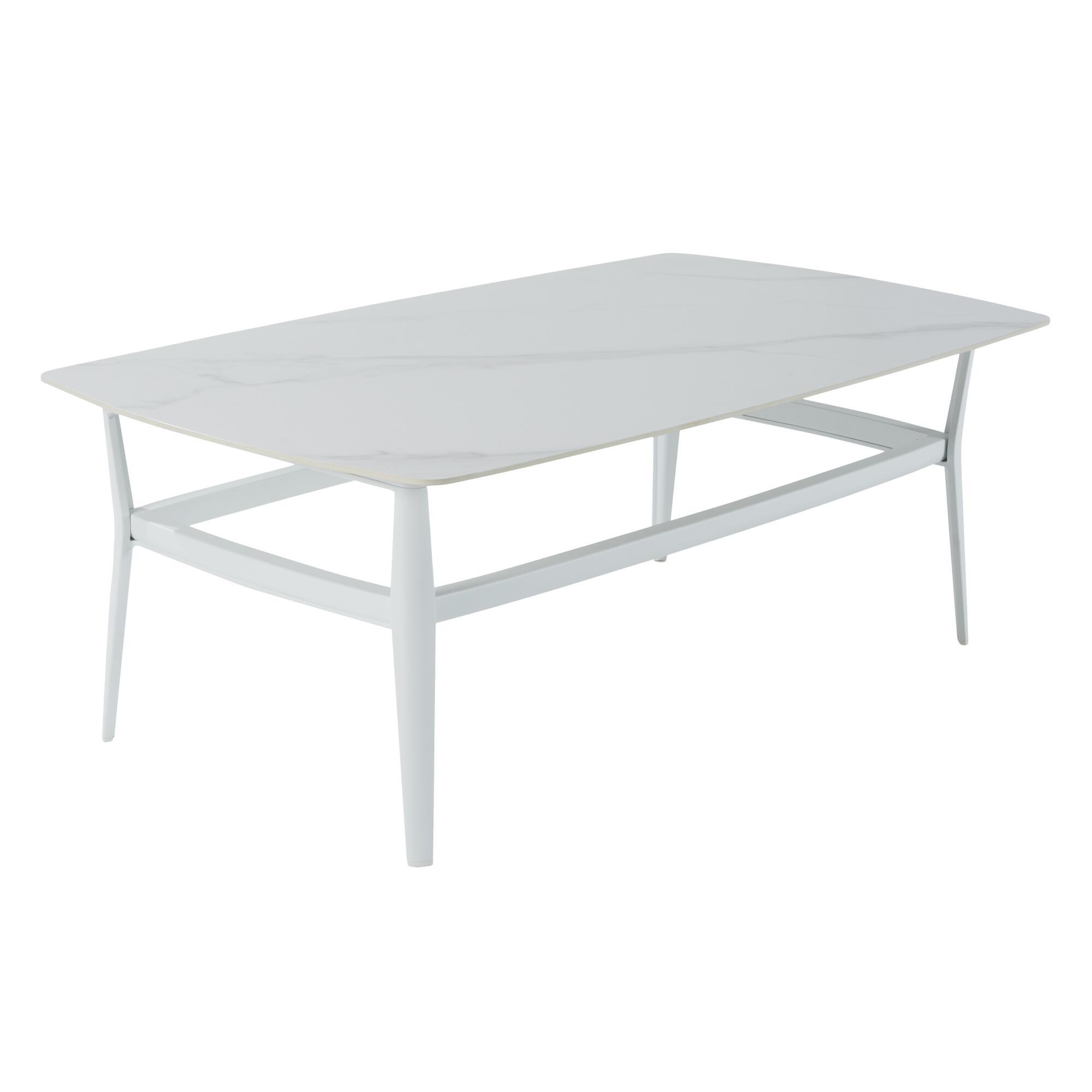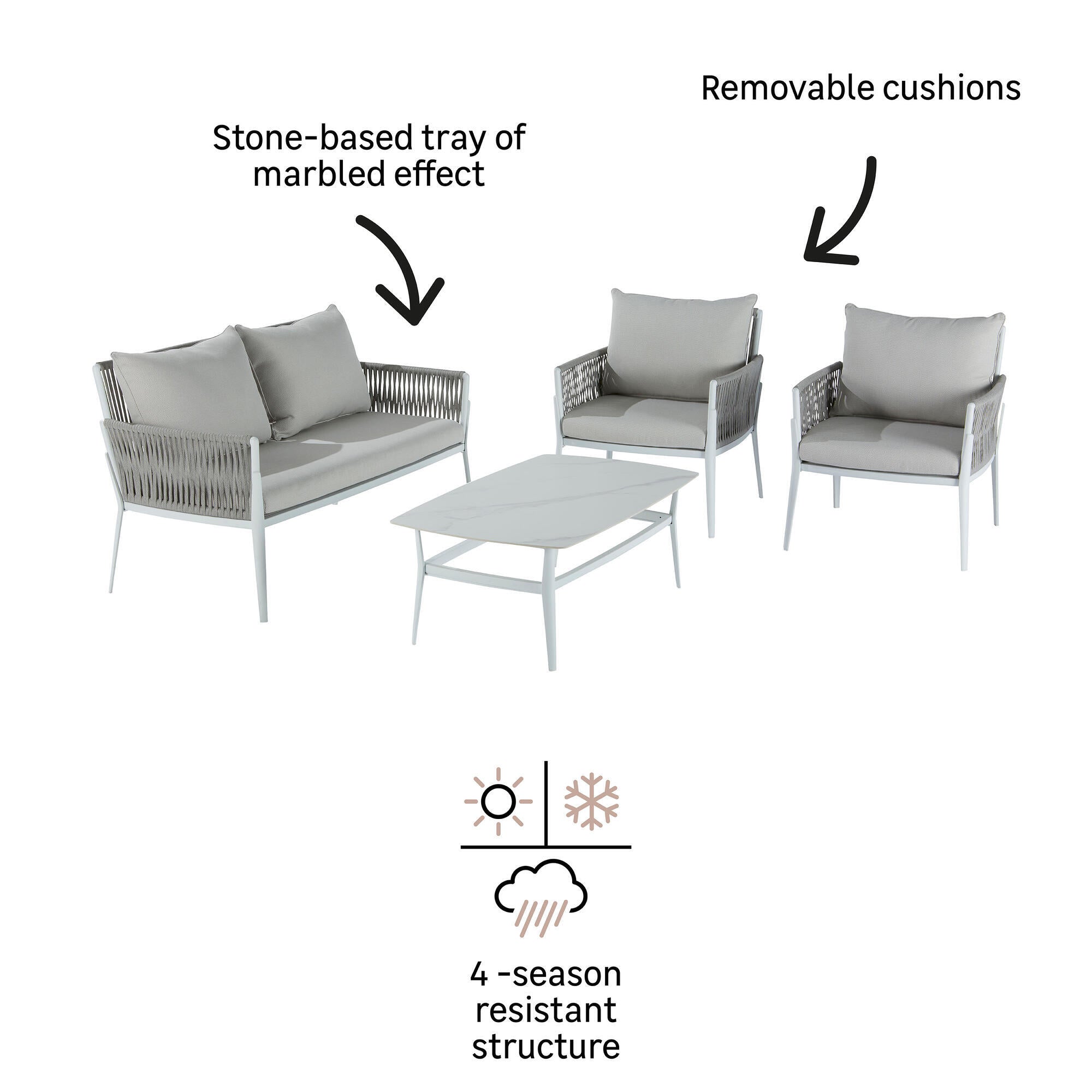גוף אלומיניום צבע לבן, בד טקסטילן איכותי עמיד בשמש, פלטת שולחן מאבן גוון שיש, 5 שנות אחריות יצרן