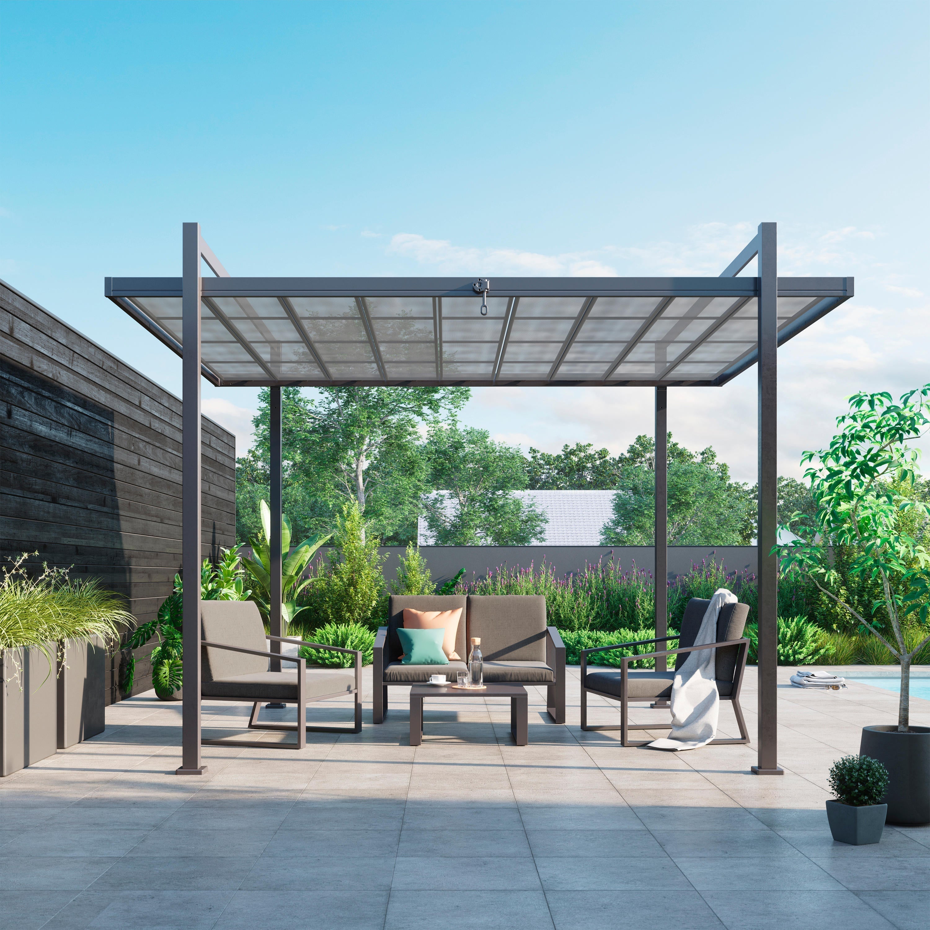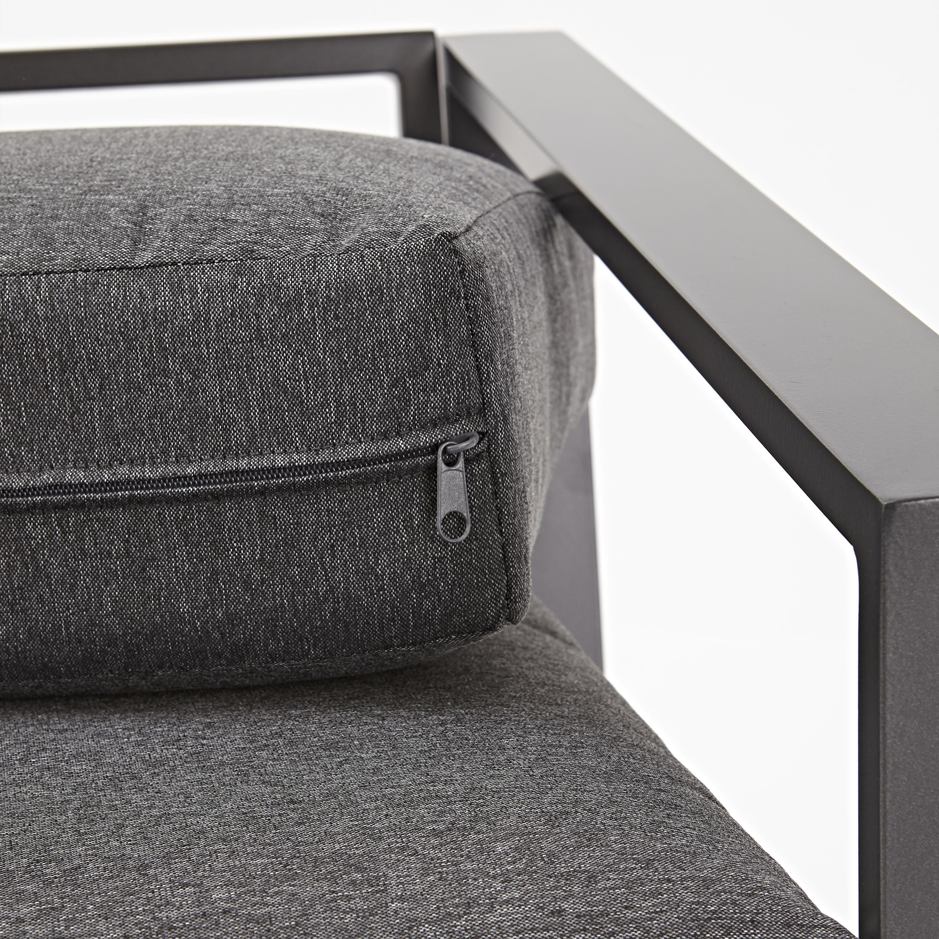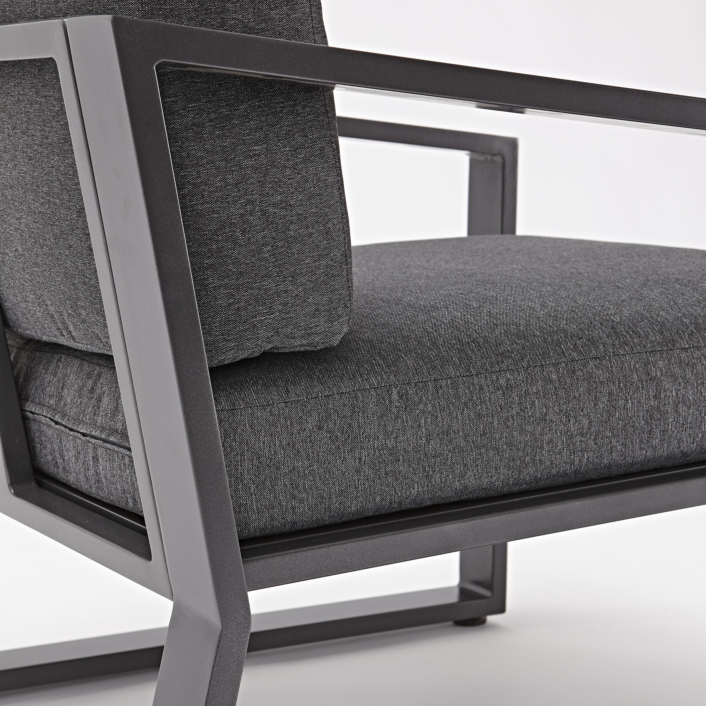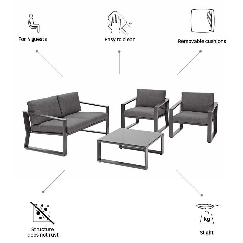 בלו רגע נעים בנוחות סביב מערכת הישיבה לגינה מסדרת Lyra. המערכת עוצבה עבור 4 אנשים, עשויה כולה מאלומיניום כדי להבטיח עמידות גבוהה בפני שינויי אקלים.