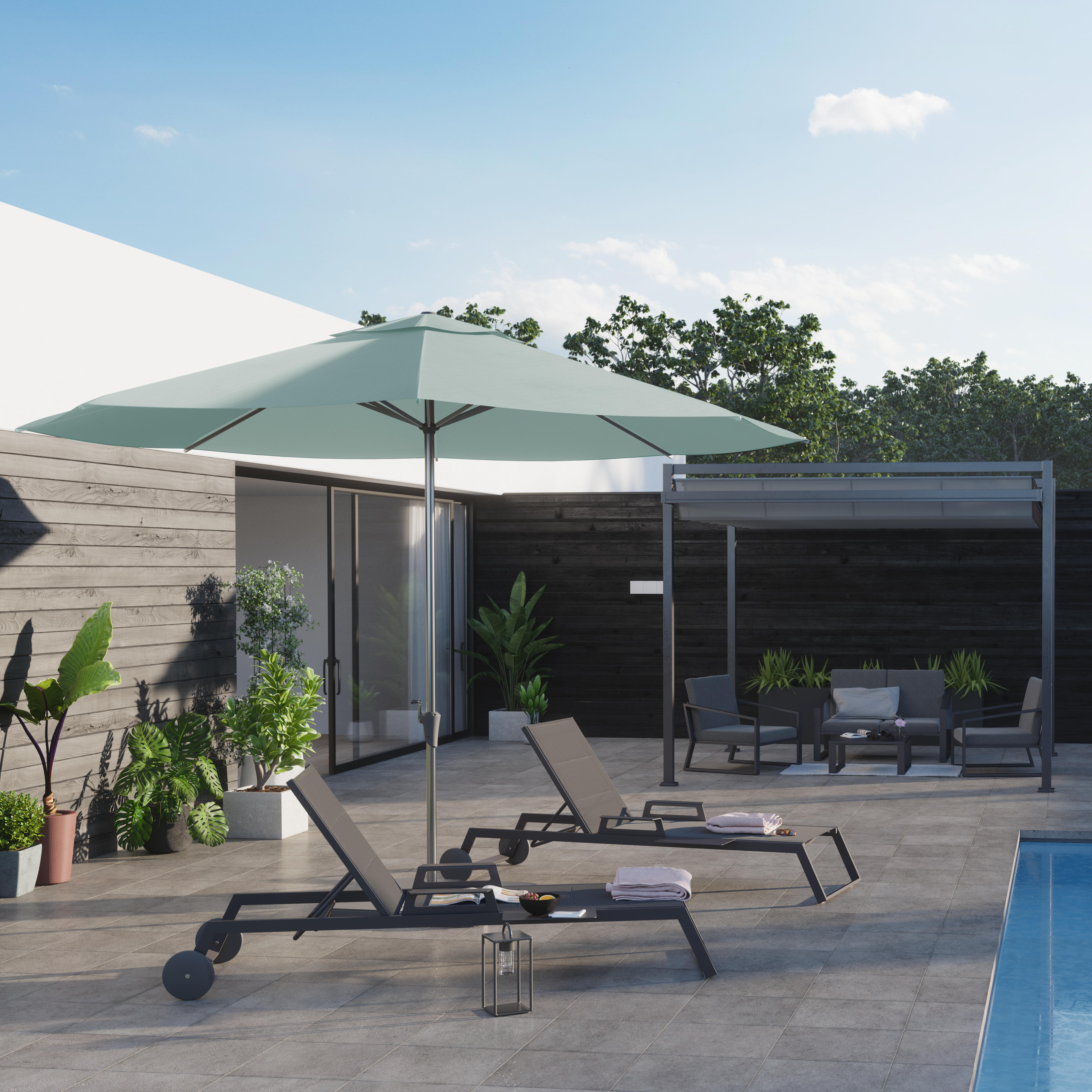 השמשייה הניצבת Aura מגנה על האורחים שלכם מפני השמש על פני שטח גדול. הסוכך המתומן עבה במיוחד ואורכו 4 מטרים, הוא דוחה מים וחוסם 100% מקרני ה-UV. לאחר השימוש ניתן לסגור את השמשייה בקלות באמצעות הכננת הצדדית. מבנה האלומיניום אינו מחליד ועמיד בפני פגעי מזג אוויר. כדי להאריך את חיי השמשייה, ניתן להחליף ולהתאים את הסוכך בהתאם לסגנון המועדף עליכם