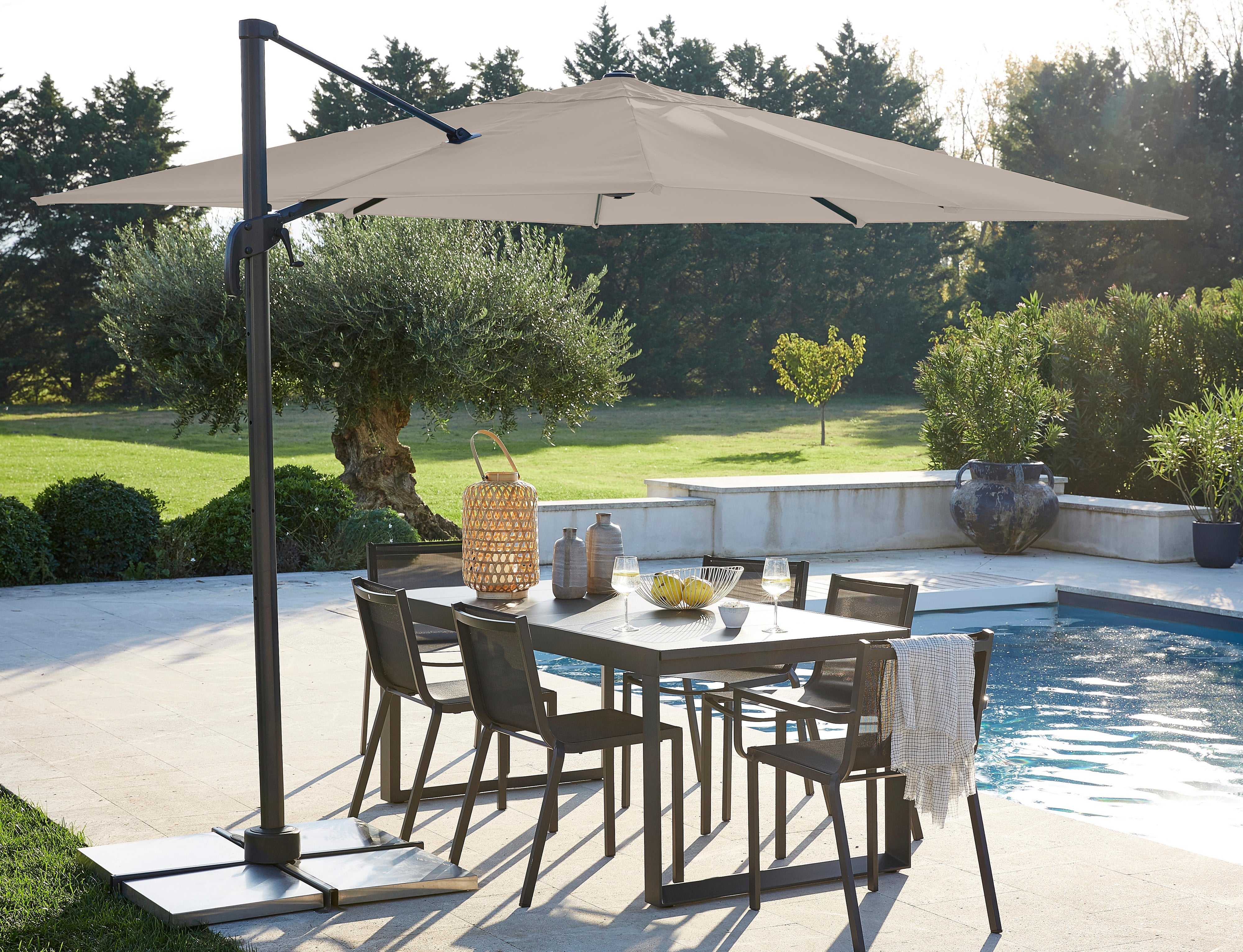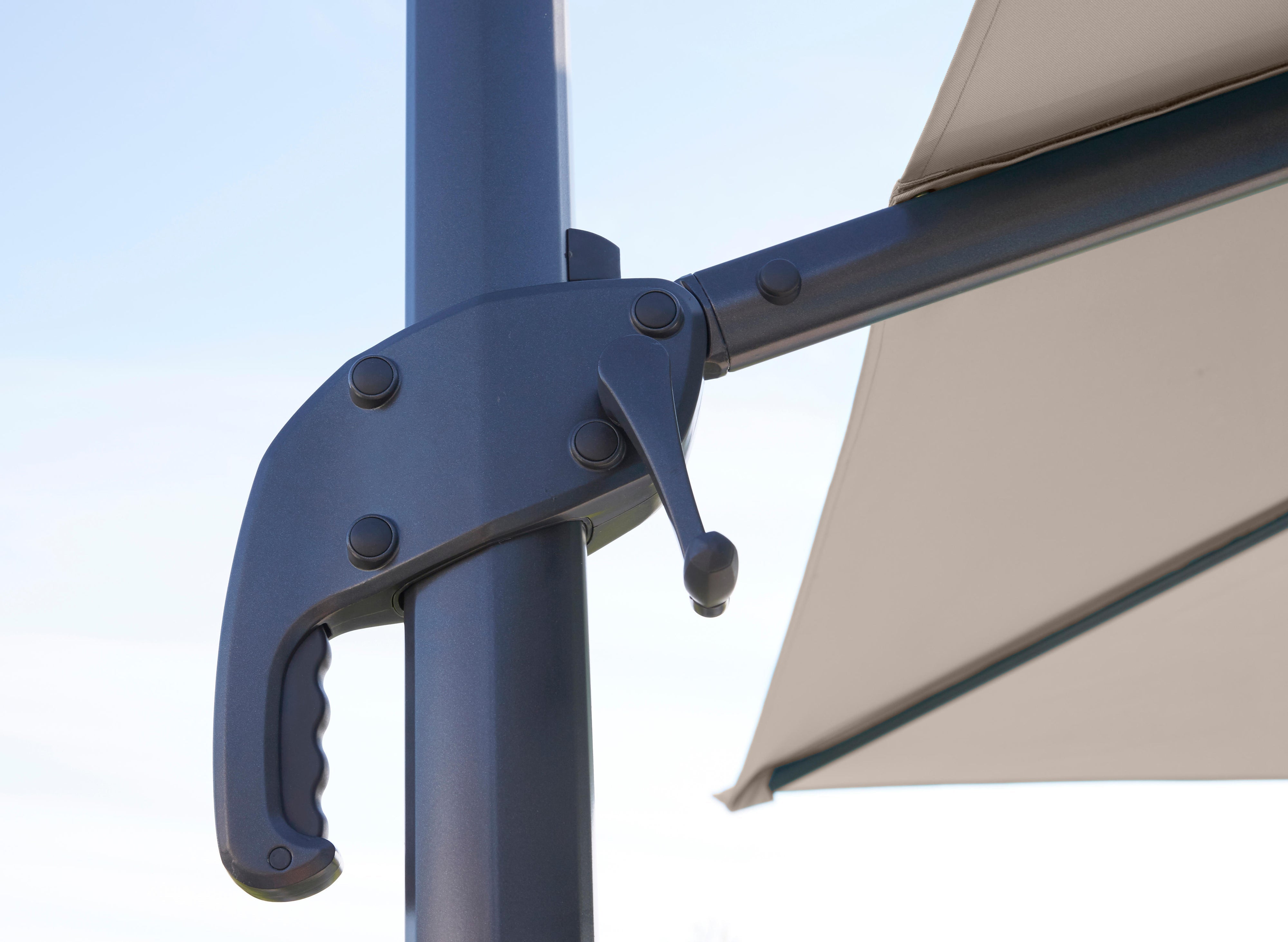 הגנו על עצמכם מפני השמש עם שמשיית Aura בצבע חום-אפור, הזמינה במספר צבעים. השמשייה מבטיחה לכם הגנה מקסימלית הודות ליכולת התמרון שלה, המאפשרת לכם להטות ולסובב אותה מבלי להפריע למעבר.