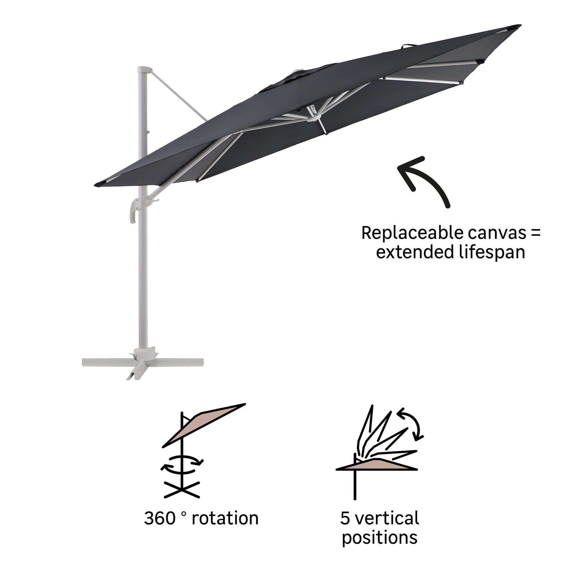 שמשיה מודרנית וקלה לשימוש לשעות אחר צהרים קרירות, שנה אחר שנה. הגנה אופטימלית בארוחת הבוקר, בהפסקת הקפה, בבילוי רגוע אחר הצהרים ובערב נעים... המרפסת שלכם תסב לכם הנאה באוויר הפתוח על בסיס יומי בהתאמה עם תזוזת השמש. עכשיו אפשר ליהנות מהשהייה בחוץ ומיתרונות השמש מבלי להסתנוור! בין אם אתם נמצאים לבד או עם אחרים, שמשיית Aura תגן עליכם ביעילות, בארוחות משותפות או ברגעי מנוחה בצל. השמשייה מרובעת ובד היריעה שלה עבה מאוד, דוחה מים וחוסם 98% מקרני ה-UV . היריעה הרחבה מציעה אזור הגנה גדול שמתחתיו ניתן להציב כל סוג של שולחן וכיסאות ל-6 אורחים. שמשיית Aura היא שמשיית צד: התורן המרכזי שלה מוטה ומקל על הצבתה מבלי לחסום את המעבר. השמשייה יכולה להסתובב 360° וגם לנטות הצידה כאשר השמש נמצאת בזווית נמוכה. היא קלה לשימוש ונסגרת בקלות בעזרת ידית הצד והכננת. המבנה, העשוי כולו מאלומיניום, עמיד בפני לחות וקורוזיה. שמשיית Aura מעניקה הגנה ומעצבת את המרפסת או הגינה שלכם בסגנון עכשווי והיריעה הריבועית וצבעה האפור-פחם מעניקים אווירה מודרנית למרחבי החוץ. ליצירת סט שלם והרמוני, שלבו את השמשייה שלכם עם מערכות הישיבה מסדרת Idaho. בתחזוקה יומיומית, צבע יריעת השמשייה אינו אמור לדהות מכיוון שהוא עשוי מפוליאסטר, ולכן עמיד במיוחד בפני קרינת UV. שמשייה זו עלולה לעוף ברוח, לכן זכרו לעגן אותה עם משקולות 120 קילוגרם הנמכרות בנפרד. בחורף, הקפידו לכסות את השמשייה עם כיסוי Naterial מתאים. המבנה מתנקה בקלות עם מטלית לחה וחומר ניקוי ניטרלי. להארכת חיי המוצר, ניתן להחליף ולהתאים את בד היריעה לפי טעמכם האישי.