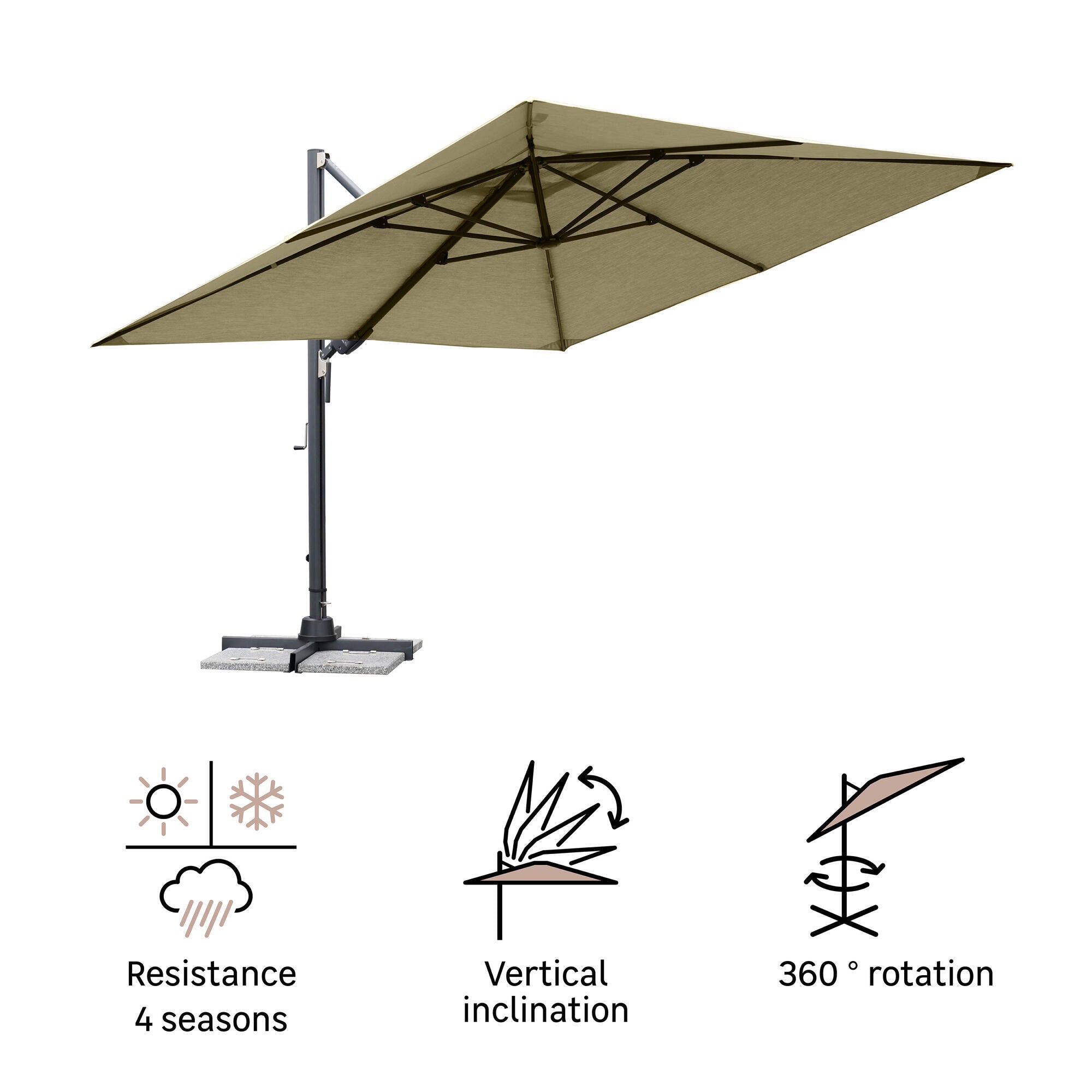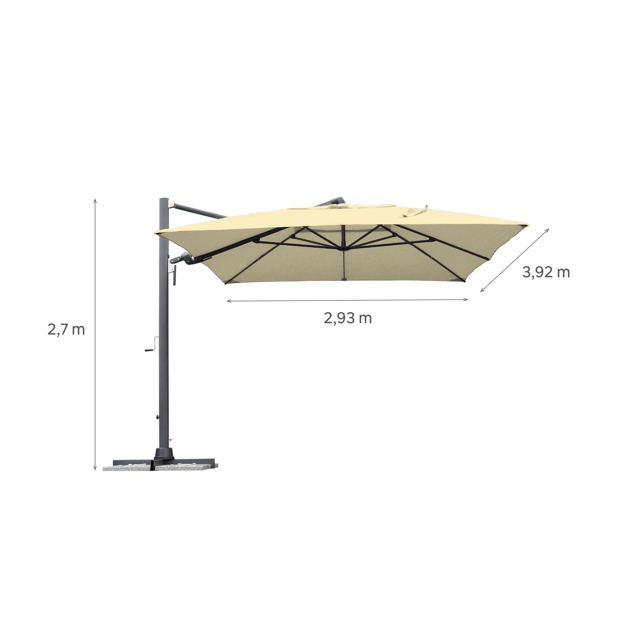 שמשיית צד שתלווה אתכם במרפסת מדי יום, כל רגע, שנה אחר שנה. תוכלו ליהנות מארוחת בוקר וצהרים במרפסת תחת השמשייה, או מכוס קפה בשעות אחר הצהרים, ובארוחת הערב תוכלו גם ליהנות מהשקיעה בחוץ. אם יש לכם שולחן גדול וגם מערכת ישיבה לגן ואתם רוצים הגנה מפני השמש, שמשיית Sombra מיועדת בדיוק בשבילכם. הממדים הנדיבים של השמשייה מאפשרים לה להצל על שולחן גדול עבור 10 אנשים או מערכת ישיבה לגן המיועדת להושבה של 5 עד 7 אנשים. הרגלית בבסיס מאפשרת לשמשייה להסתובב °360 סביב התורן, הכננת שעל התורן שולטת ברמת הפתיחה ושתי הידיות בבסיס היריעה מאפשרות לבחור הטיה אנכית ואופקית. השמשייה, הזמינה ב-3 צבעים קלאסיים, תשתלב בקלות עם הרהיטים שלכם. טיפים להארכת חיי השמשייה שלכם – בד היריעה של שמשיית הצד Sombra אינו דוהה מכיוון שהוא עשוי אקריליק העמיד במיוחד בפני קרינת UV. יחד עם השמשייה מסופק כיסוי מגן שבו ניתן להשתמש כדי להגן עליה כאשר היא לא בשימוש. עקב גודלה, יש צורך להתקין משקולת של 200 קילוגרמים כדי לעגן אותה היטב לקרקע ולסגור אותה כאשר יש רוח חזקה.